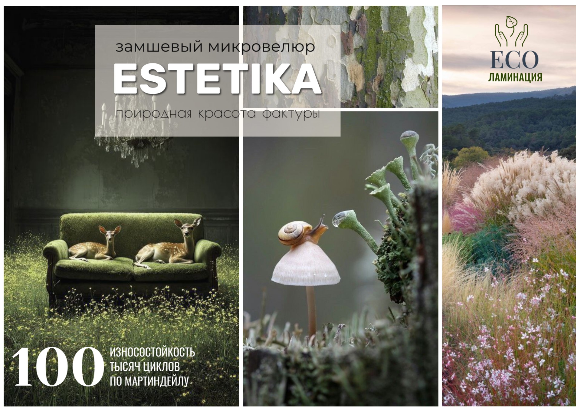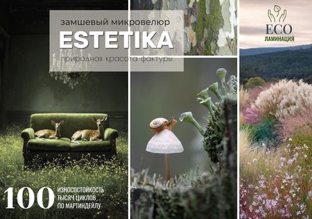 Природная эстетика по насыщенности и обилию красок не сравнится ни с чем, при этом она настолько близка человеку, что воспринимается легко и естественно. Также, как наша коллекция замшевого велюра с одноименным названием. Estetika обладает богатой палитрой натуральных цветов, приятной на ощупь фактурой с легким естественным зерном, выполненной при помощи эко-ламинации.